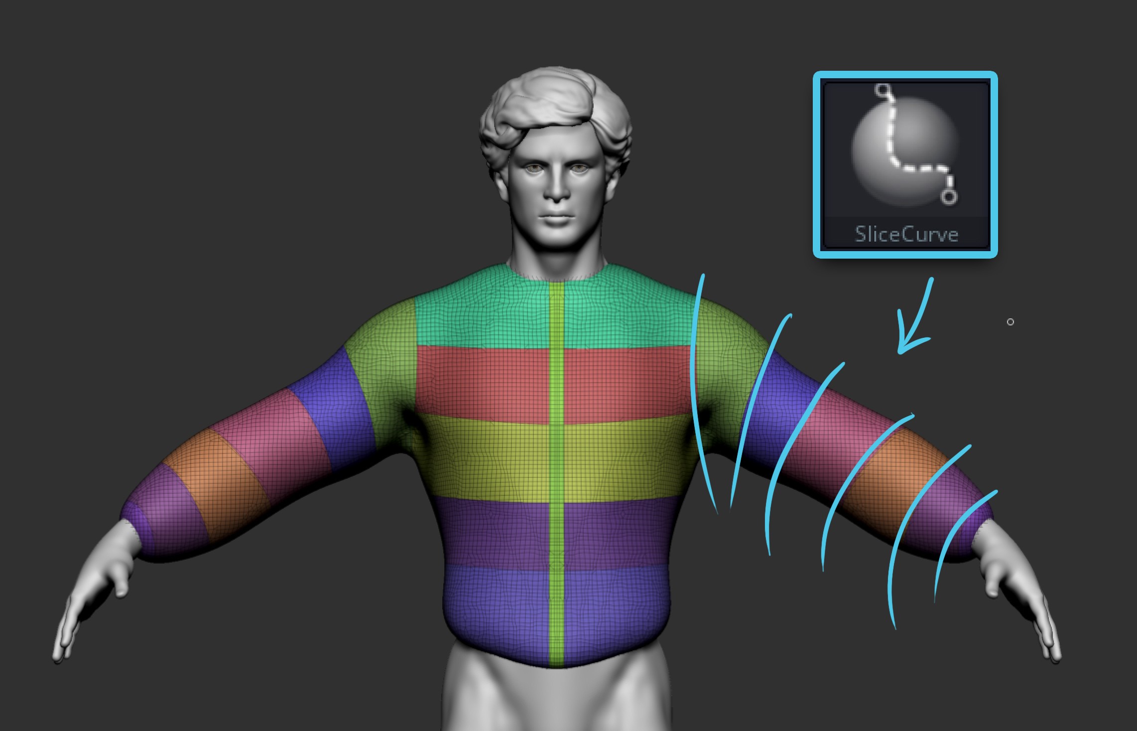 STEP 2: with the SliceCurve brush, cut up the jacket (or anything else) into various polygroups. The idea here is to cut wherever you want to have a tension point like the seams in the jacket: