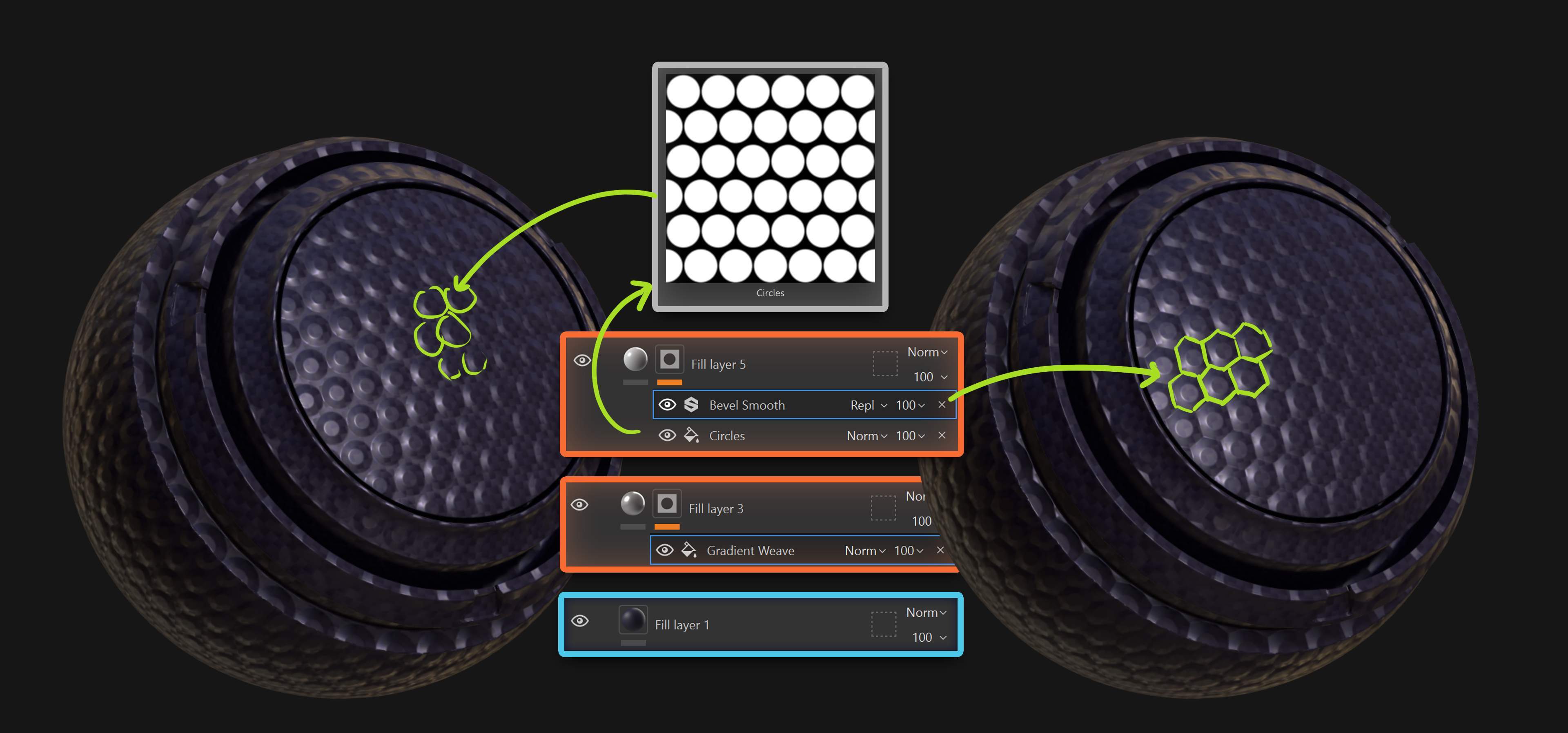 New Fill Layer. Black mask. Add something like “Circles”…. This is where the material starts feeling designed.