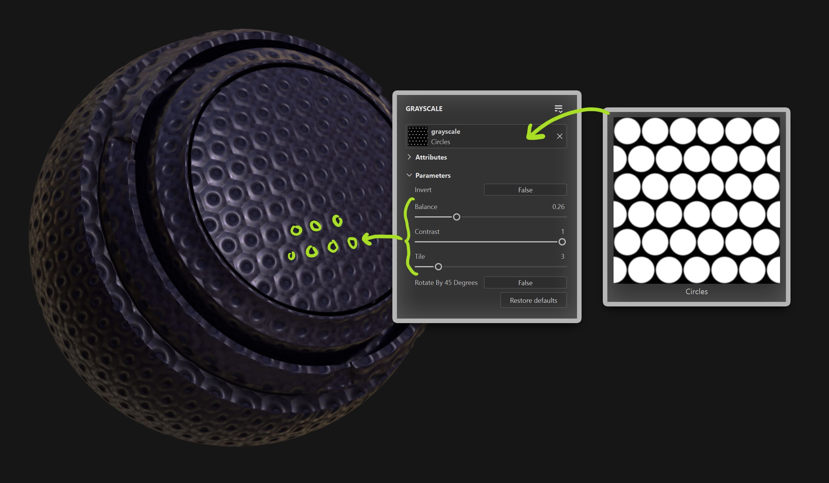 Then tweak Balance and Contrast so the circles get smaller. Use height to push them inward and suddenly you have a perforated feel… Same pattern. Different read!
