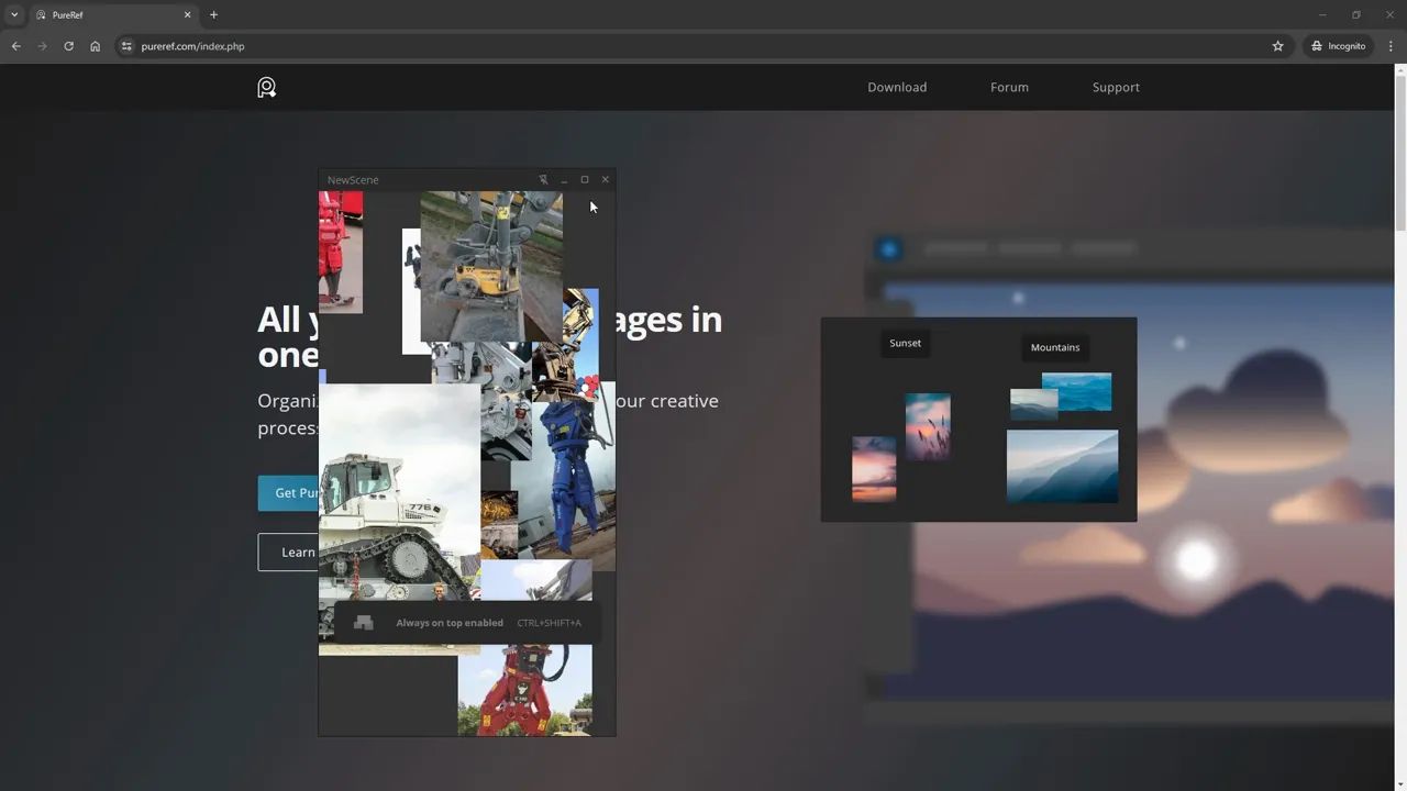Download PureRef from puref.com; it's free, with an option to donate. Once installed, open your PureRef board and get familiar with the main window. One small but game-changing UI update in PureRef 2.0 is the ability to pin the board, keeping it always on top.