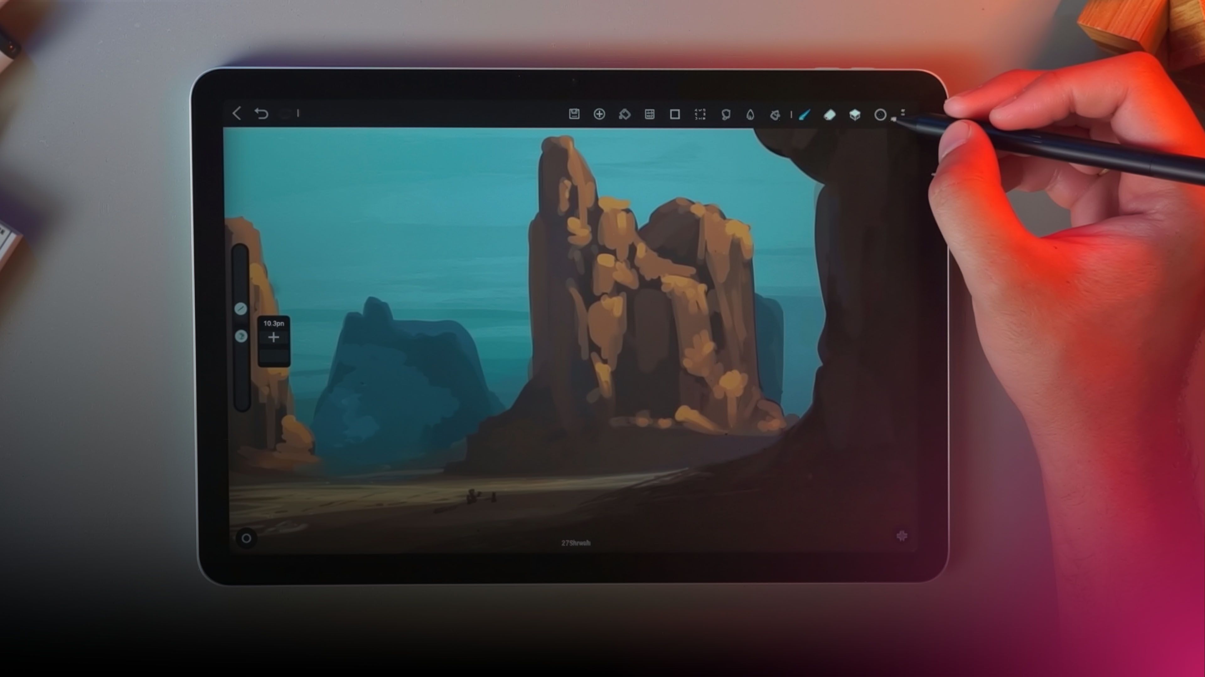 With a transparent render and shadow catcher you can quickly create a coloured backdrop that complements your PolyPaint. Two quick fills with a radial mask, a dark desaturated base and a brighter, saturated radial to create a subtle halo, will frame the character and enhance the silhouette.