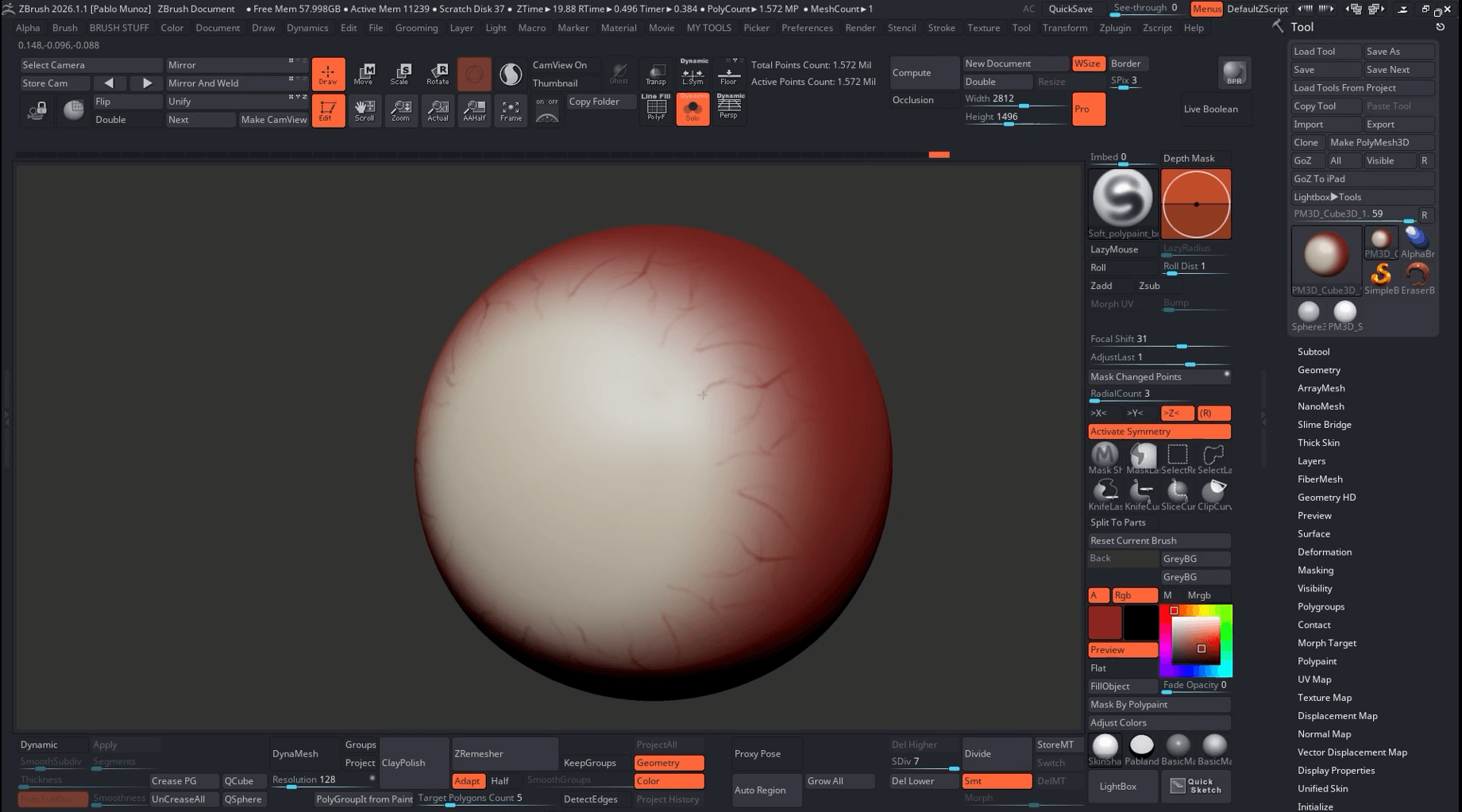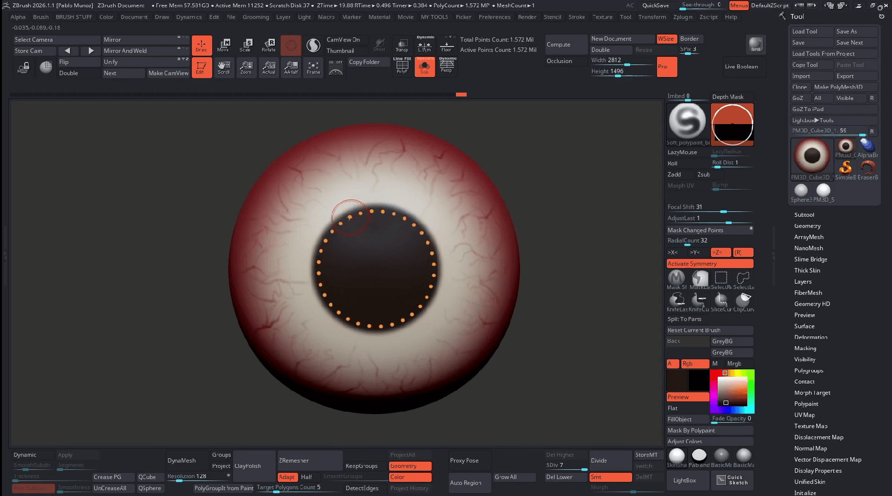 Enable radial symmetry (Transform > Activate Symmetry) on the Z axis and set a high radial count (32 works well) while blocking big shapes. Pick a lighter, slightly yellow‑white for the sclera and paint a soft gradient toward the centre. The red base will remain visible toward the back of the eye.