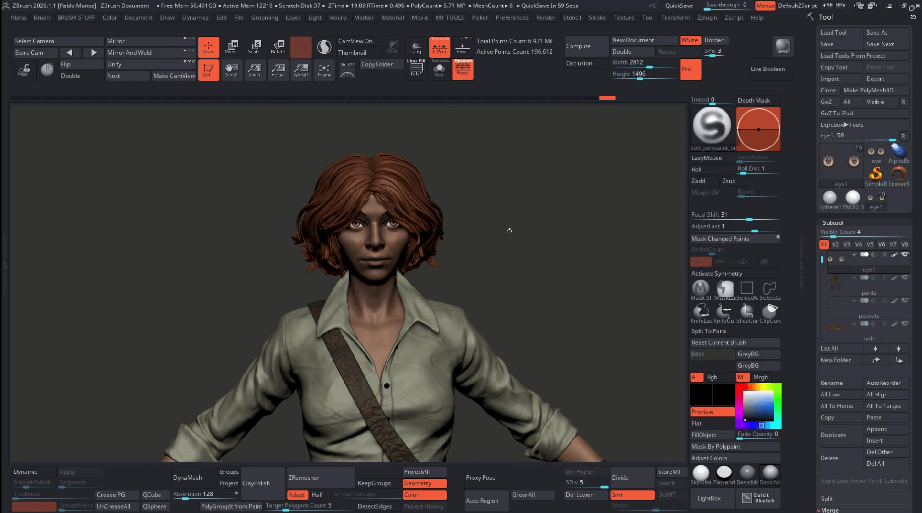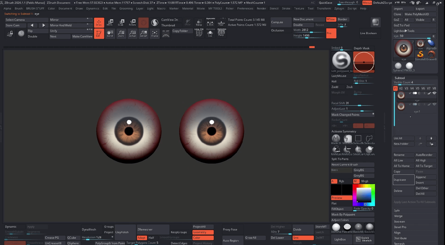 Save the eye subtool into your ZTools folder (Lightbox location) or use the User tab in newer ZBrush (2026.1 and up) versions to keep a portable folder. Save as a ZTools so you can drag/drop or double‑click to load the eye into any scene.